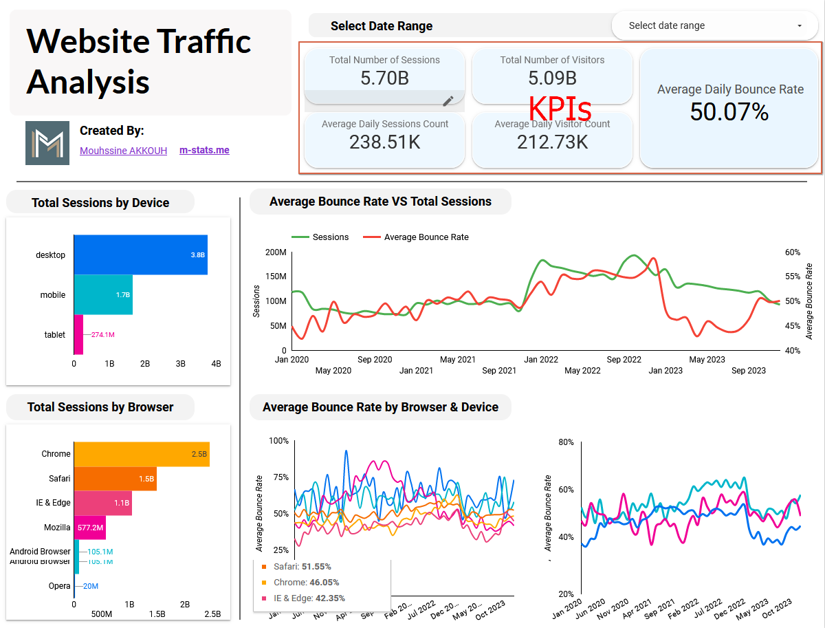 We tracked some key performance indicators to get a comprehensive overview of website traffic and engagement, and get a quick assessment of user interaction patterns.